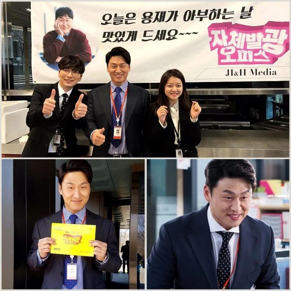 소속사 공개한 사진 속 현수막 문구에는 극중 캐릭터 이용재분을 빗대어 ‘오늘은 용재가 아부하는 날’이라며 현장 스태프들에게 폭소를 자아낸다.