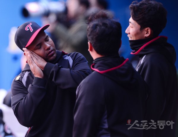 16일 대구 삼성라이온즈파크에서 ‘2017 타이어뱅크 KBO리그’ 시범경기 삼성 라이온즈와 LG 트윈스의 경기가 열렸다. 더그아웃에서 LG 히메네스가 동료들과 장난을 치고 있다.