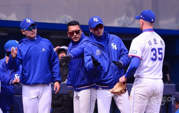 16일 대구 삼성라이온즈파크에서 ‘2017 타이어뱅크 KBO리그’ 시범경기 삼성 라이온즈와 LG 트윈스의 경기가 열렸다. 삼성 우규민이 1회초 이닝을 마치고 들어오는 선발 페트릭과 하이파이브를 하고 있다.