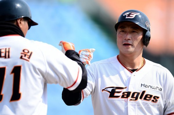 16일 대전 한화생명이글스파크에서 ‘2017 타이어뱅크 KBO리그’ 한화 이글스와 넥센 히어로즈의 시범경기가 열렸다. 2회말 1사 3루에서 한화 정현석이 1타점 적시타를 치고난 뒤 최태원 코치의 환영을 받고 있다.