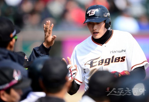 16일 대전 한화생명이글스파크에서 ‘2017 타이어뱅크 KBO리그’ 한화 이글스와 넥센 히어로즈의 시범경기가 열렸다. 2회말 1사 3루에서 한화 정현석의 1타점 적시타 때 득점에 성공한 신성현이 동료들의 환영을 받고 있다.