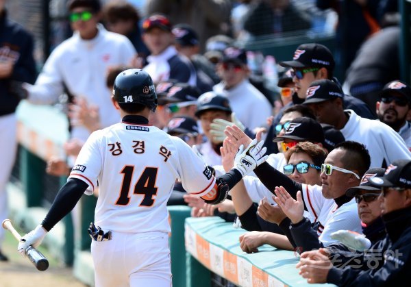 16일 대전 한화생명이글스파크에서 ‘2017 타이어뱅크 KBO리그’ 한화 이글스와 넥센 히어로즈의 시범경기가 열렸다. 1회말 1사에서 한화 강경학이 넥센 선발 신재영을 상대로 우월 솔로 홈런을 쏘아올린 뒤 동료들의 환영을 받고 있다.