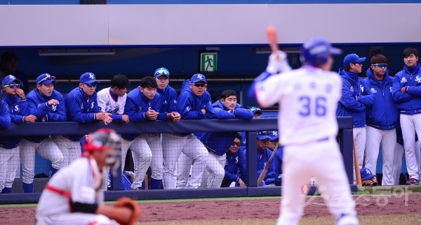 16일 대구 삼성라이온즈파크에서 ‘2017 타이어뱅크 KBO리그’ 시범경기 삼성 라이온즈와 LG 트윈스의 경기가 열렸다. 9회말 선두타자로 나온 삼성 이승엽의 타석을 더그아웃 선수들이 지켜보고 있다.