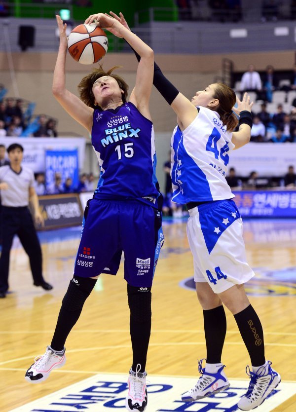 16일 아산 이순신체육관에서 열린 ‘삼성생명 2016-2017 여자프로농구’ 아산 우리은행과 용인 삼성생명의 챔피언결정전 1차전경기에서 우리은행 이선화와 삼성생명 허윤자가 리바운드를 다투고 있다.