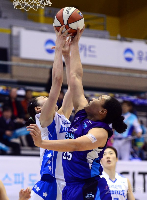 16일 아산 이순신체육관에서 열린 ‘삼성생명 2016-2017 여자프로농구’ 아산 우리은행과 용인 삼성생명의 챔피언결정전 1차전경기에서 삼성생명 김한별과 우리은행 홍보람이 리바운드를 다투고 있다.
