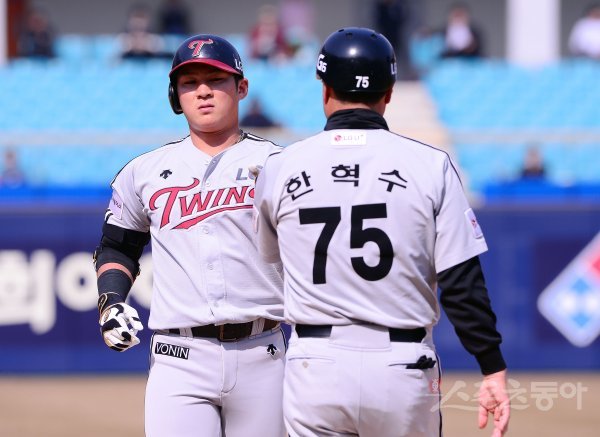 17일 대구 삼성라이온즈파크에서 ‘2017 타이어뱅크 KBO리그’ 시범경기 삼성 라이온즈와 LG 트윈스의 경기가 열렸다. 5회초 2사 1,3루에서 LG 오지환이 1타점 적시타를 친 후 한혁수 코치의 축하를 받고 있다.