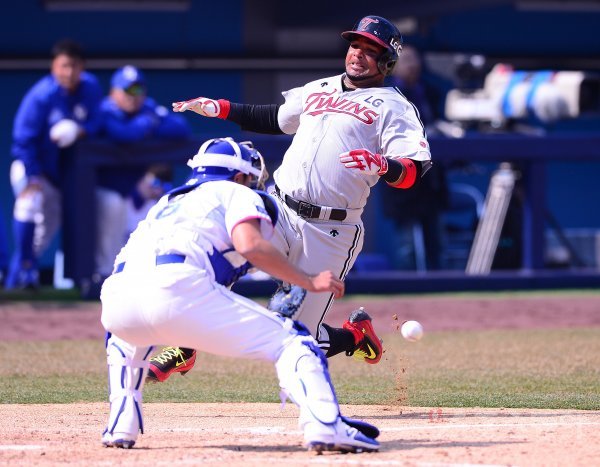 17일 대구 삼성라이온즈파크에서 ‘2017 타이어뱅크 KBO리그’ 시범경기 삼성 라이온즈와 LG 트윈스의 경기가 열렸다. 5회초 2사 1,3루에서 LG 정성훈의 안타 때 히메네스가 홈으로 쇄도하고 있다. 결과는 태그아웃.