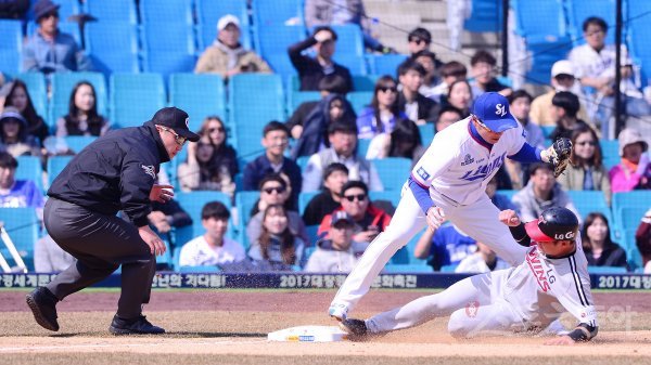 17일 대구 삼성라이온즈파크에서 ‘2017 타이어뱅크 KBO리그’ 시범경기 삼성 라이온즈와 LG 트윈스의 경기가 열렸다. 5회초 2사 1,3루에서 LG 오지환이 박용택의 적시타 때 3루까지 쇄도해 세이프 되고 있다.