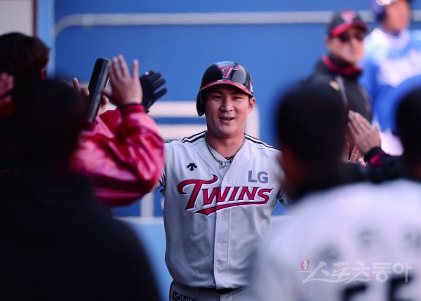 17일 대구 삼성라이온즈파크에서 ‘2017 타이어뱅크 KBO리그’ 시범경기 삼성 라이온즈와 LG 트윈스의 경기가 열렸다. 5회초 2사 1,3루에서 LG 오지환이 히메네스의 적시타 상황에서 홈을 밟은 후 더그아웃에서 동료들의 축하를 받고 있다.