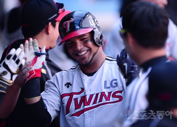 17일 대구 삼성라이온즈파크에서 ‘2017 타이어뱅크 KBO리그’ 시범경기 삼성 라이온즈와 LG 트윈스의 경기가 열렸다. 7회초 2사 1루에서 LG 히메네스가 삼성 세 번째 투수 박근홍을 상대로 투런홈런을 친 후 더그아웃에서 동료들의 축하를 받고 있다.