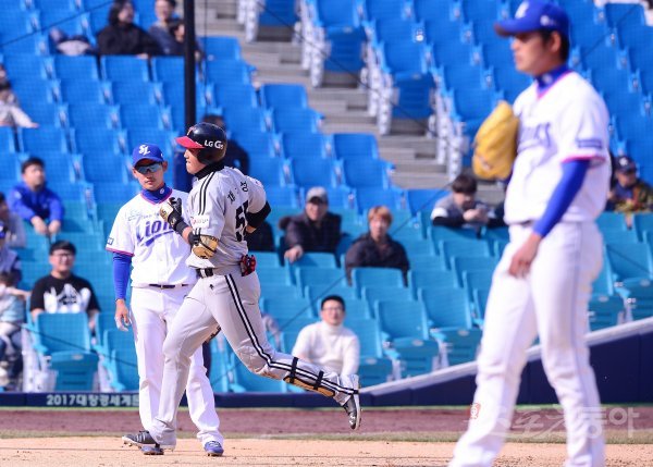 17일 대구 삼성라이온즈파크에서 ‘2017 타이어뱅크 KBO리그’ 시범경기 삼성 라이온즈와 LG 트윈스의 경기가 열렸다. 9회초 무사 2루에서 LG 채은성이 삼성 백정현을 상대로 투런홈런을 친 후 그라운드를 돌고 있다.