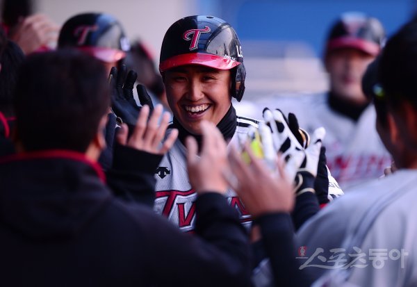17일 대구 삼성라이온즈파크에서 ‘2017 타이어뱅크 KBO리그’ 시범경기 삼성 라이온즈와 LG 트윈스의 경기가 열렸다. 9회초 무사 2루에서 LG 채은성이 삼성 백정현을 상대로 투런홈런을 친 후 더그아웃에서 동료들의 축하를 받고 있다.