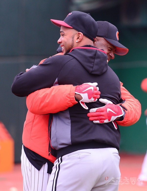 18일 부산 사직야구장에서 ‘2017 타이어뱅크 KBO리그’ 시범경기 롯데 자이언츠와 LG 트윈스의 경기가 열린다. 경기를 앞두고 롯데 프랑코 코치가 LG 히메네스와 포옹을 하고 있다.