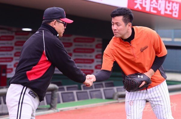 18일 부산 사직야구장에서 ‘2017 타이어뱅크 KBO리그’ 시범경기 롯데 자이언츠와 LG 트윈스의 경기가 열린다. 경기를 앞두고 롯데 강민호가 LG 양상문 감독(왼쪽)과 악수를 나누고 있다.