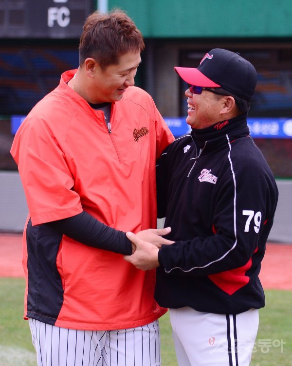 18일 부산 사직야구장에서 ‘2017 타이어뱅크 KBO리그’ 시범경기 롯데 자이언츠와 LG 트윈스의 경기가 열린다. 경기를 앞두고 롯데 이대호가 LG 양상문 감독(오른쪽)이 웃으며 대화를 나누고 있다.