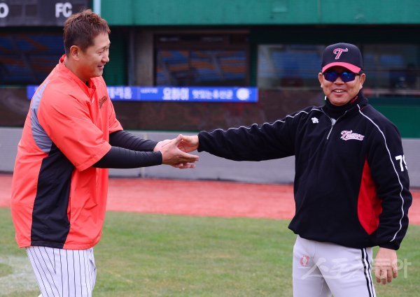18일 부산 사직야구장에서 ‘2017 타이어뱅크 KBO리그’ 시범경기 롯데 자이언츠와 LG 트윈스의 경기가 열린다. 경기를 앞두고 롯데 이대호가 LG 양상문 감독(오른쪽)이 인사를 나누고 있다.