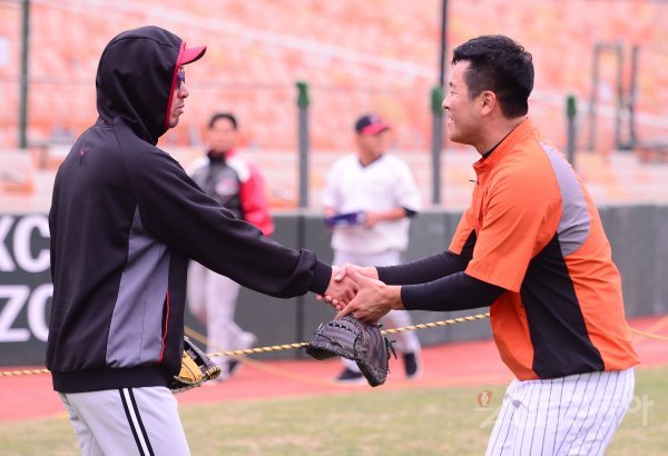 18일 부산 사직야구장에서 ‘2017 타이어뱅크 KBO리그’ 시범경기 롯데 자이언츠와 LG 트윈스의 경기가 열린다. 경기를 앞두고 LG 정성훈과 롯데 강민호(오른쪽)가 악수를 나누고 있다.