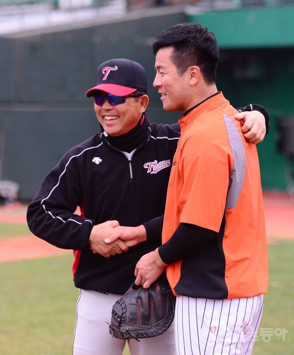 18일 부산 사직야구장에서 ‘2017 타이어뱅크 KBO리그’ 시범경기 롯데 자이언츠와 LG 트윈스의 경기가 열린다. 경기를 앞두고 LG 양상문 감독과 롯데 강민호(오른쪽)가 웃으며 대화를 나누고 있다.
