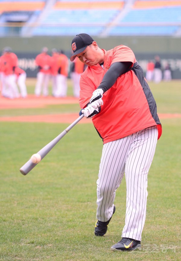 18일 부산 사직야구장에서 ‘2017 타이어뱅크 KBO리그’ 시범경기 롯데 자이언츠와 LG 트윈스의 경기가 열린다. 경기를 앞두고 롯데 이대호가 배팅 훈련을 하고 있다.