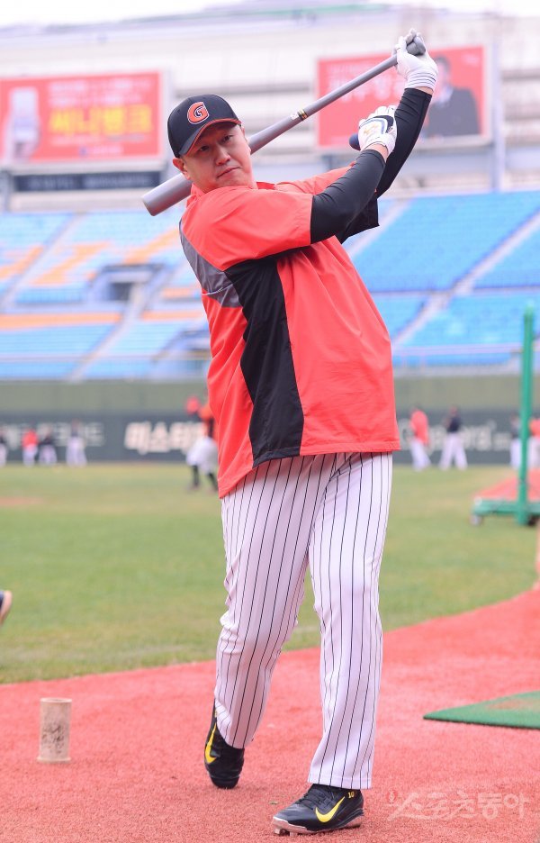 18일 부산 사직야구장에서 ‘2017 타이어뱅크 KBO리그’ 시범경기 롯데 자이언츠와 LG 트윈스의 경기가 열린다. 경기를 앞두고 롯데 이대호가 배팅 훈련을 하고 있다.
