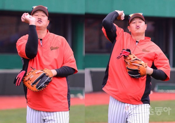18일 부산 사직야구장에서 ‘2017 타이어뱅크 KBO리그’ 시범경기 롯데 자이언츠와 LG 트윈스의 경기가 열린다. 경기를 앞두고 롯데 이대호가 캐치볼을 하는 중 익살스러운 포즈와 표정을 짓고 있다.