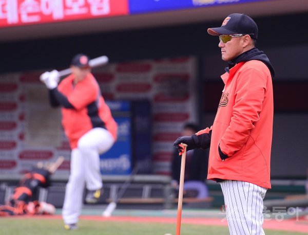 18일 부산 사직야구장에서 ‘2017 타이어뱅크 KBO리그’ 시범경기 롯데 자이언츠와 LG 트윈스의 경기가 열린다. 경기를 앞두고 롯데 조원우 감독이 선수들의 훈련을 지켜보고 있다.