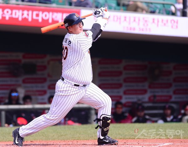 18일 부산 사직야구장에서 ‘2017 타이어뱅크 KBO리그’ 시범경기 롯데 자이언츠와 LG 트윈스의 경기가 열렸다. 1회말 1사 3루에서 롯데 이대호가 적시타를 치고 있다.