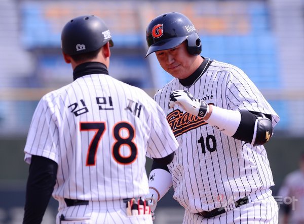 18일 부산 사직야구장에서 ‘2017 타이어뱅크 KBO리그’ 시범경기 롯데 자이언츠와 LG 트윈스의 경기가 열렸다. 1회말 1사 3루에서 롯데 이대호가 적시타를 친 후 김민재 코치와 하이파이브를 하고 있다.