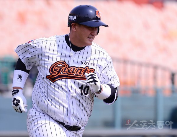18일 부산 사직야구장에서 ‘2017 타이어뱅크 KBO리그’ 시범경기 롯데 자이언츠와 LG 트윈스의 경기가 열렸다. 1회말 1사 3루에서 롯데 이대호가 적시타를 치고 있다.