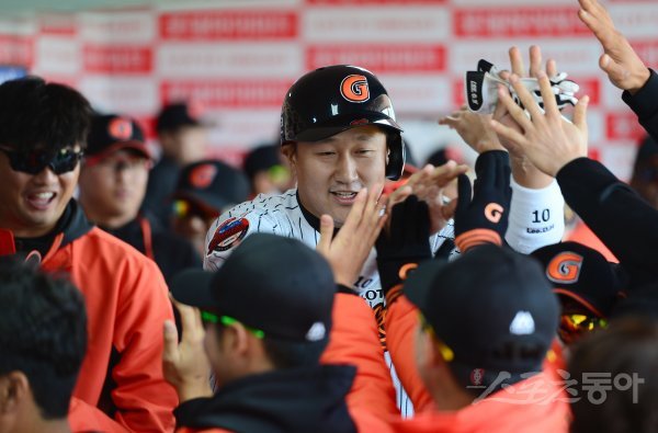 18일 부산 사직야구장에서 ‘2017 타이어뱅크 KBO리그’ 시범경기 롯데 자이언츠와 LG 트윈스의 경기가 열렸다. 1회말 1사 2,3루에서 롯데 이대호가 김문호의 희생플라이 때 세이프 된 후 더그아웃에서 동료들과 기쁨을 나누고 있다.