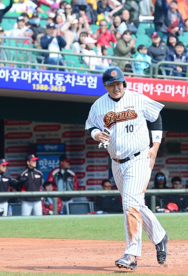 18일 부산 사직야구장에서 ‘2017 타이어뱅크 KBO리그’ 시범경기 롯데 자이언츠와 LG 트윈스의 경기가 열렸다. 1회말 1사 2,3루에서 롯데 이대호가 김문호의 희생플라이 때 세이프 된 후 미소를 짓고 있다.