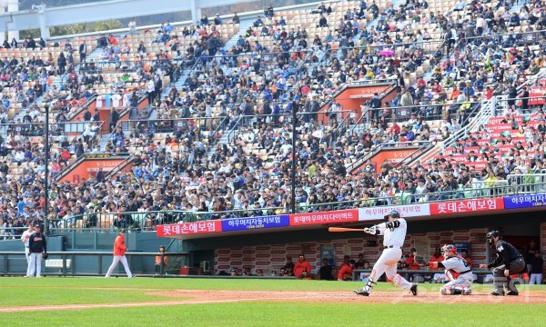 18일 부산 사직야구장에서 ‘2017 타이어뱅크 KBO리그’ 시범경기 롯데 자이언츠와 LG 트윈스의 경기가 열렸다. 2회말 2사 2루에서 롯데 이대호가 LG 선발 김대현을 상대로 투런홈런을 치고 있다.