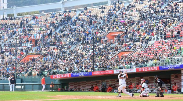 18일 부산 사직야구장에서 ‘2017 타이어뱅크 KBO리그’ 시범경기 롯데 자이언츠와 LG 트윈스의 경기가 열렸다. 2회말 2사 2루에서 롯데 이대호가 LG 선발 김대현을 상대로 투런홈런을 치고 타구를 지켜보고 있다.