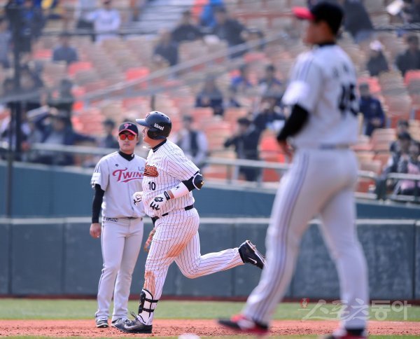 18일 부산 사직야구장에서 ‘2017 타이어뱅크 KBO리그’ 시범경기 롯데 자이언츠와 LG 트윈스의 경기가 열렸다. 2회말 2사 2루에서 롯데 이대호가 LG 선발 김대현을 상대로 투런홈런을 치고 그라운드를 돌고 있다.
