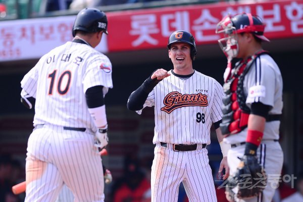 18일 부산 사직야구장에서 ‘2017 타이어뱅크 KBO리그’ 시범경기 롯데 자이언츠와 LG 트윈스의 경기가 열렸다. 롯데 번즈가 2회말 2사 2루에서 LG 선발 김대현을 상대로 투런홈런을 치고 홈으로 들어오는 이대호를 축하해주고 있다.