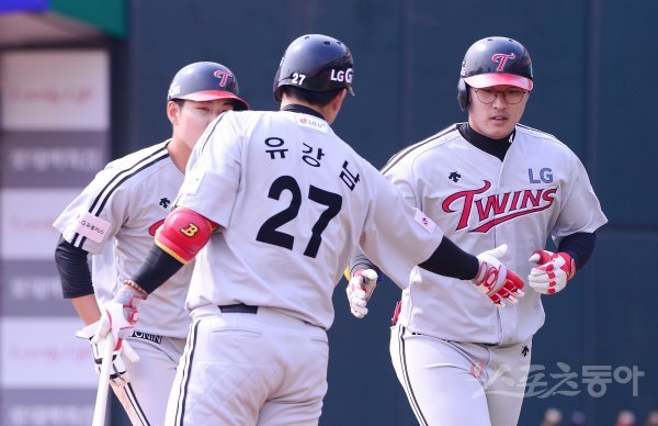 18일 부산 사직야구장에서 ‘2017 타이어뱅크 KBO리그’ 시범경기 롯데 자이언츠와 LG 트윈스의 경기가 열렸다. LG 서상우(오른쪽)가 3회초 2사 2루에서 롯데 선발 미켈을 상대로 투런홈런을 친 후 홈에서 동료들의 축하를 받고 있다.