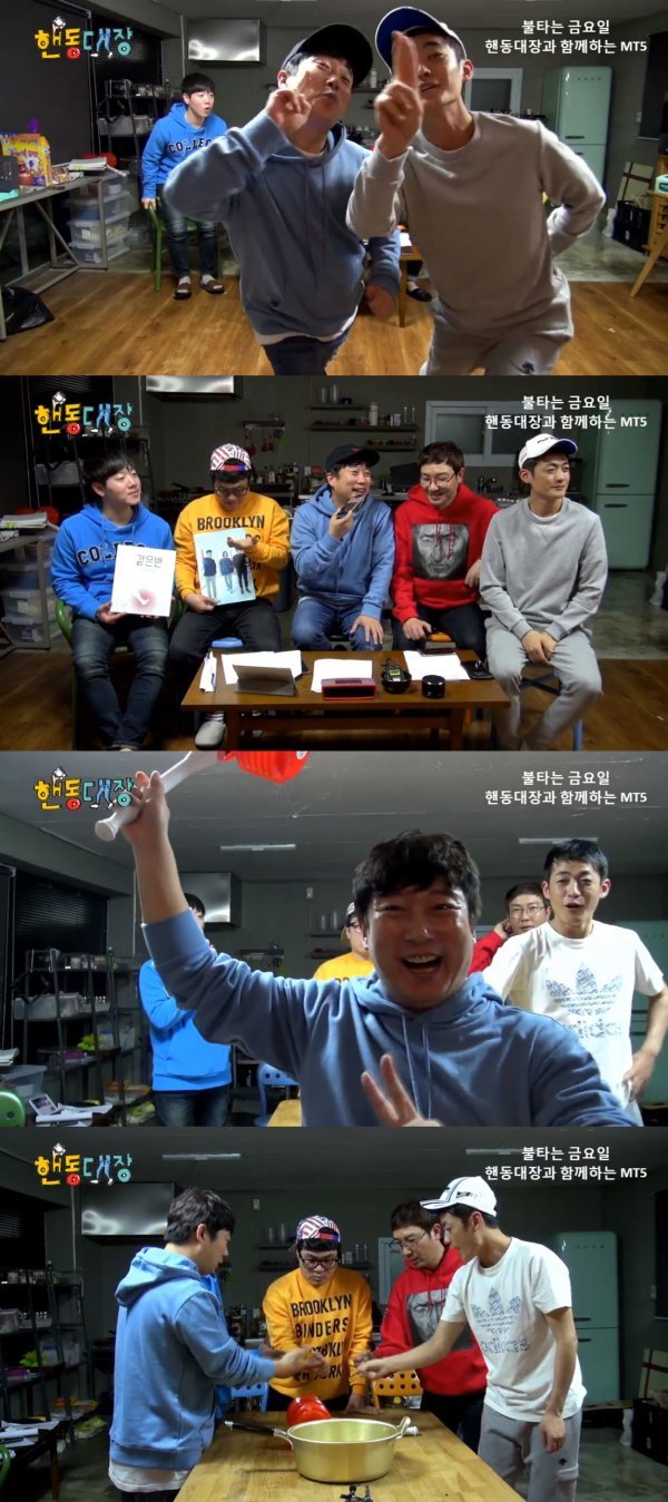 17일 생중계 방송된 ‘핸동대장’은 ‘불타는 금요일 핸동대장과 함께하는 MT5탄’으로 진행되었으며, 방송 시작 이래 최초로 광고 의뢰가 들어왔기에 멤버들 모두 자축하는 멘트로 기분 좋은 시작을 알렸다.