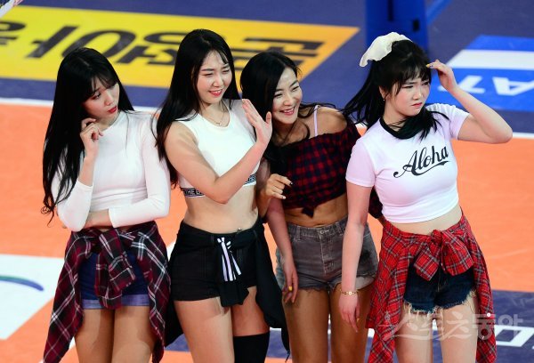 19일 천안 유관순체육관에서 ‘2016-2017 NH농협 V리그’ 천안 현대캐피탈과 수원 한국전력의 플레이오프 1차전 경기가 열렸다. 현대캐피탈 치어리더가 화려한 공연을 선보이고 있다.