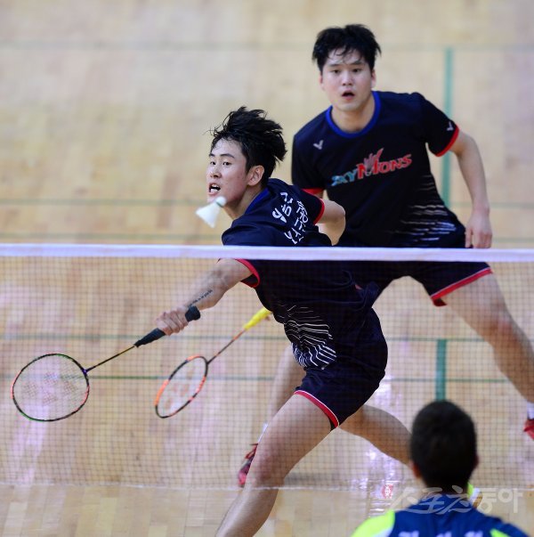19일 경남 밀양배드민턴경기장에서 열린 ‘2017 전국봄철종별배드민턴리그전’ 남자일반부 단체전 복식에서 인천국제공항 김동주-임종근(앞) 조가 스매싱 공격을 하고 있다.