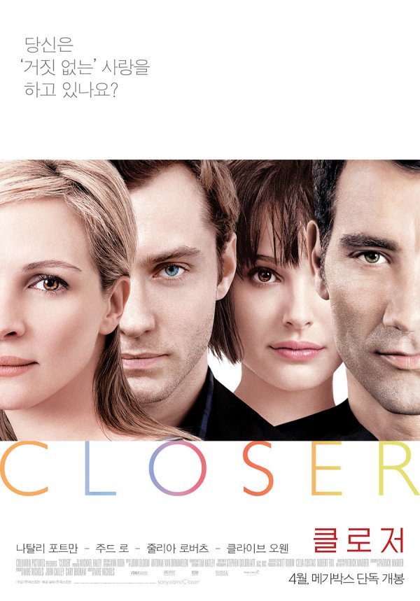 ‘클로저’는 네 남녀의 서로 다른 사랑 방식을 통해 사랑의 이면을 과감하게 그려낸 솔직하고 대담한 로맨스로 진실한 사랑에 대한 고찰과 할리우드 톱배우들의 뜨거운 열연, 영화의 여운을 더한 명품 OST까지, ‘로맨스 영화의 수작’으로 손꼽히고 있는 작품.