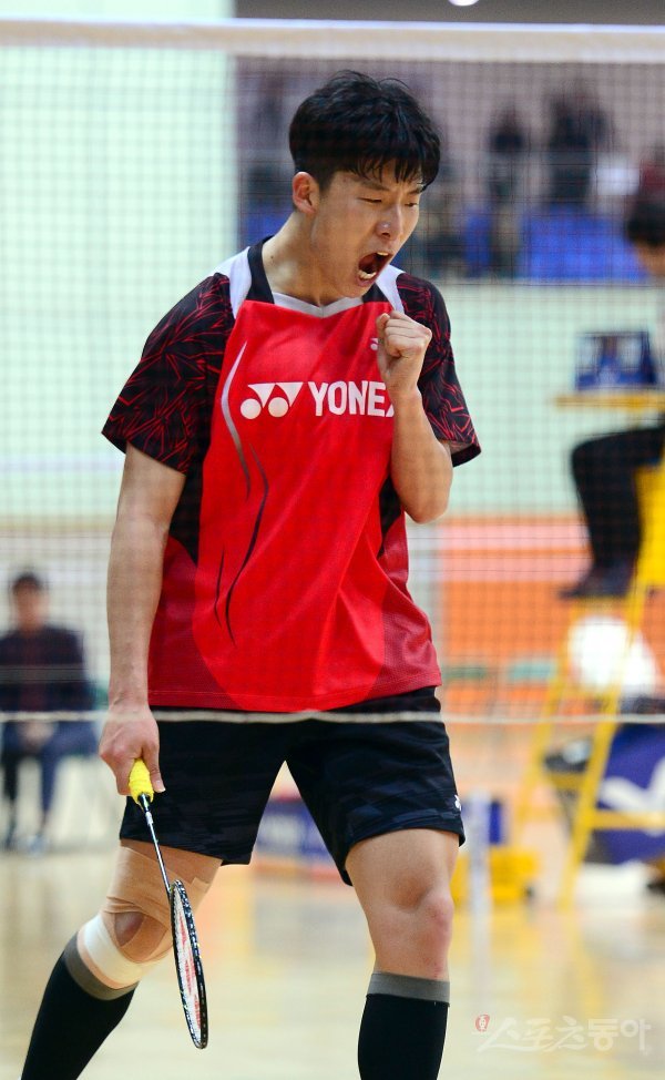 20일 경남 밀양배드민턴경기장에서 열린 ‘2017 전국봄철종별배드민턴리그전’ 남자일반부 단체전 단식에서 요넥스 강민우가 승리한 후 환호하고 있다.
