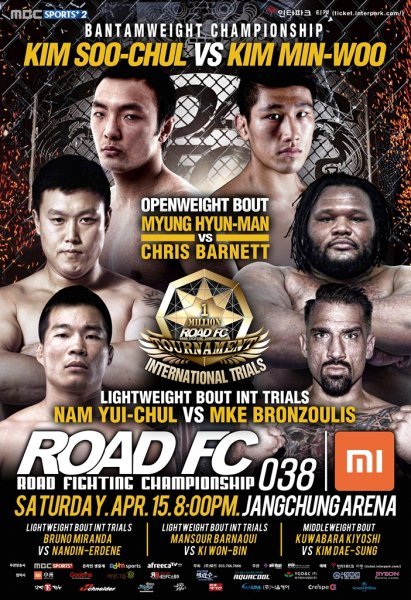 4월 15일 서울 장충체육관에서 개최되는 XIAOMI ROAD FC 038의 전대진이 확정됐다. 이번 대회에는 ‘밴텀급 챔피언’ 이윤준의 챔피언 타이틀 반납으로 공석이던 밴텀급 왕좌의 주인을 가릴 김수철과 김민우의 타이틀전이 치러진다. 또한 남의철을 비롯한 세계 여러 단체의 챔피언 출신들이 출전하는 ROAD FC 100만불 토너먼트 ‘ROAD TO A-SOL’ 인터내셔널 지역예선 B조 경기도 만날 수 있다.