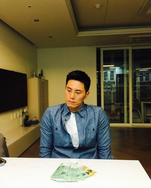 사진 속 김재우는 돈이 놓여져 있는 식탁 앞에 앉아 다소 불쌍한 표정을 하고 있다.