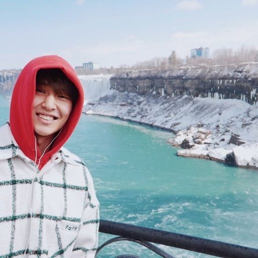 사진 속 온유는 한 폭포 앞에서 빨간 후드티를 뒤집어 쓰고 환한 미소를 짓고 있다.