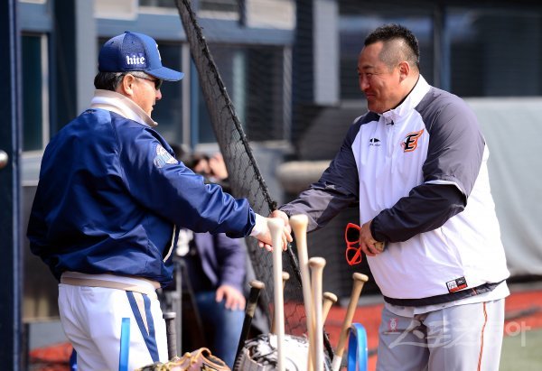 21일 창원 마산야구장에서 ‘2017 타이어뱅크 KBO 리그’ 한화이글스와 NC다이노스 시범경기가 열린다. 경기 전 한화 조인성이 NC 김경문 감독에게 인사를 하고 있다.