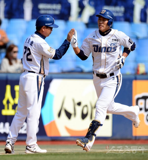 21일 창원 마산야구장에서 ‘2017 타이어뱅크 KBO 리그’ 한화이글스와 NC다이노스 시범경기가 열렸다. 5회말 무사 NC 모창민이 우월 솔로 홈런을 날리고 그라운드를 돌며 하이파이브 하고 있다.