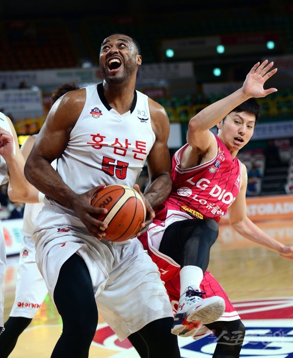 21일 창원실내체육관에서 열린 ‘2016~2017 KCC 프로농구’ KGC인삼공사와 창원LG 경기에서 KGC 사이먼이 LG 김시래의 수비를 뚫고 골밑슛을 하고 있다.