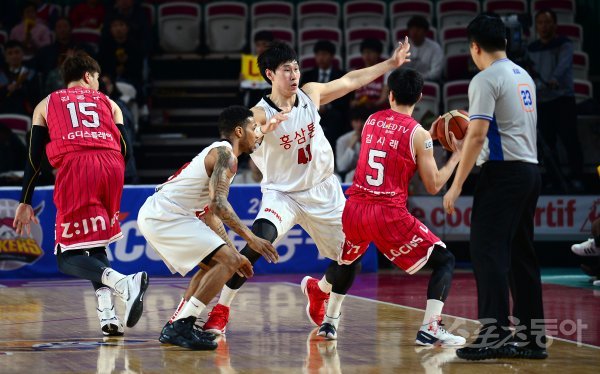 21일 창원실내체육관에서 열린 ‘2016~2017 KCC 프로농구’ KGC인삼공사와 창원LG 경기에서 KGC 사익스와 오세근이 LG 김시래를 밀착 수비하고 있다.