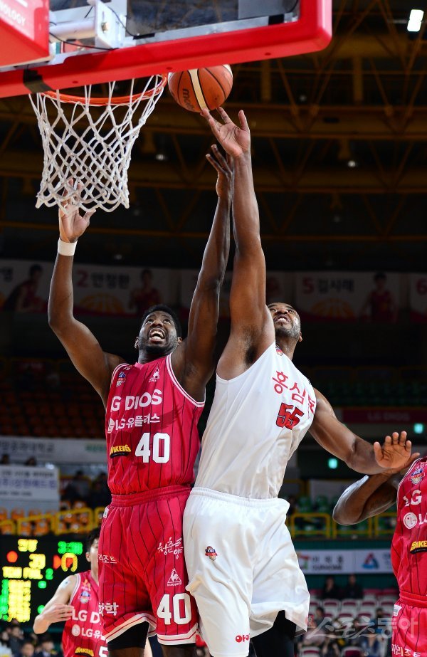 21일 창원실내체육관에서 열린 ‘2016~2017 KCC 프로농구’ KGC인삼공사와 창원LG 경기에서 KGC 사이먼과 LG 메이스가 리바운드 볼을 다투고 있다.