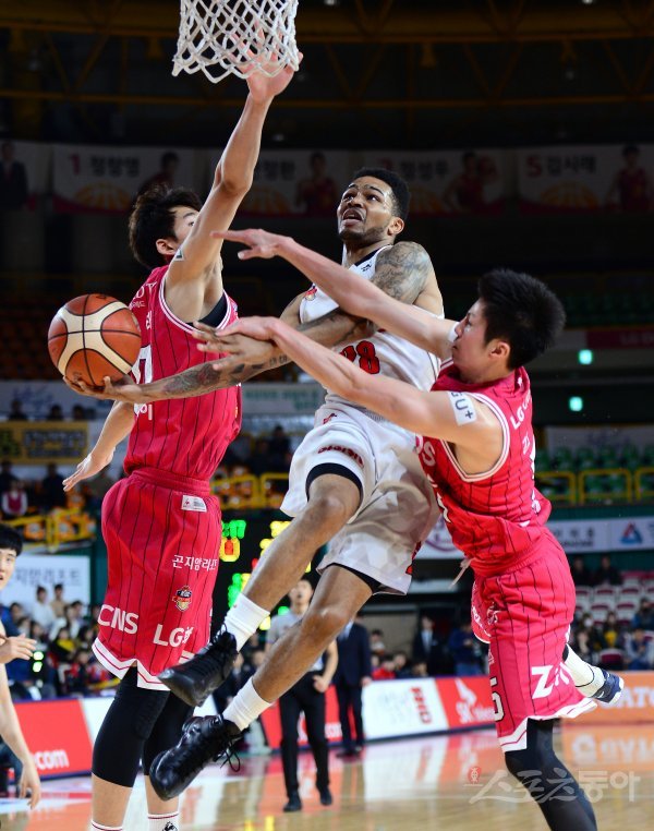 21일 창원실내체육관에서 열린 ‘2016~2017 KCC 프로농구’ KGC인삼공사와 창원LG 경기에서 KGC 사익스가 LG의 수비를 뚫고 골밑슛을 하고 있다.
